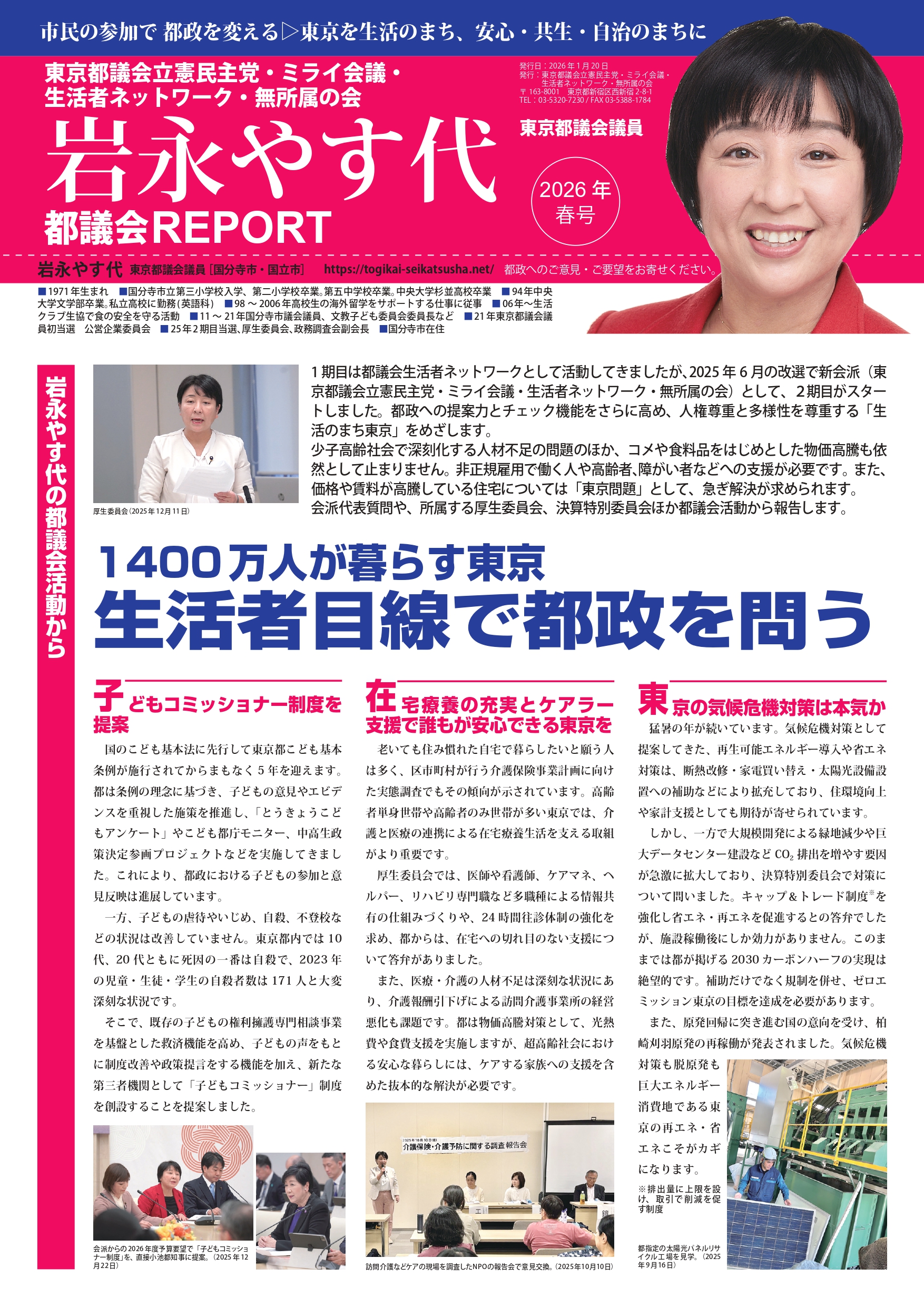 都議会レポート2026年春号 Jan.30,2026 都議会レポートを発行しました。お読みいただきご意見等お寄せいただければと思います。(紙面をクリックすると1面、2面をPDFで見ることができます) 都議会レポート2026年春号1月20日発行